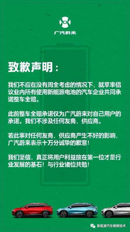 Ŀǰ£¬¹ãÆûεÀ´ÒѾʹËÊÂÎñÔÚ΢²©°ä²¼ÖÂǸÉêÃ÷£º¡°ÎÒÃDz»Ó¦ÔÚûÓÐÖÜȫ˼¿¼µÄÇé¿öÏ£¬¾ÍÁʲݽ¨ÒéÒµÄÚËùÓÐʹÓÃÐÂÄÜÔ´µç³ØµÄÆû³µÆóÒµ¹²Í¬³ÐŵÕû³µÈ«Åâ¡£´ËǰÕû³µÈ«Åâ³Ðŵ½öΪ¹ãÆûηñ¾ö×Ô¼ºÓû§µÄ³Ðŵ¡£ÎÒÃDz»Éæ¼°ÈκÎÓÑÉÌ¡¢¹©¸øÉÌ¡£Èô´ËʶÔÈκÎÓÑÉÌ¡¢¹©¸øÉ̲úÉú²»ºÃµÄÓ°Ï죬¹ãÆûη´°µÊ¾Ê®Íò·ÖÕæÖ¿µÄǸÒ⣡ÎÒÃǼáÐÅ£¬ÕæÕý½«Óû§ÀûÒæ·ÅÔÚµÚһλ²ÅÊÇÐÐÒµ·¢Õ¹µÄ»ùʯ£¡ÓëÐÐÒµÖîλ¹²Ã㣡¡±