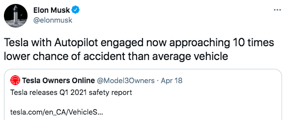 ͬÔÚÖÜÄ©£¬Âí˹¿ËÔÚÍÆÌØÉϳơ¸ÌØË¹À­×Ô¶¯¼ÝÊ»°²È«ÐÔÊÇͨ³£³µ10±¶¡¹¡£